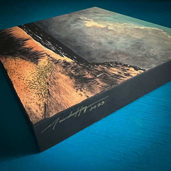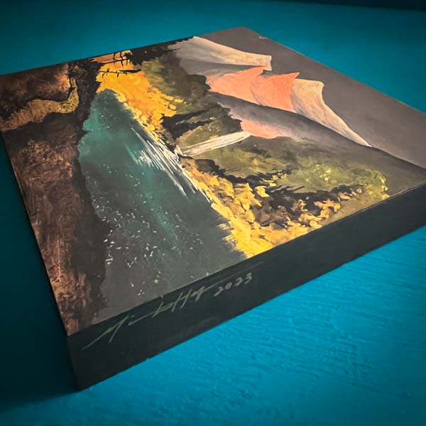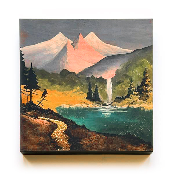 The original 12in x 12in mixed media paintings in the Good Way collection feature a barren foreground executed in black ink and charcoal leading into a full color mountain scene with waterfall and serene lake. A landscape infused with spiritual meaning, the effect is one of moving from desolation and despair into hope and renewal.