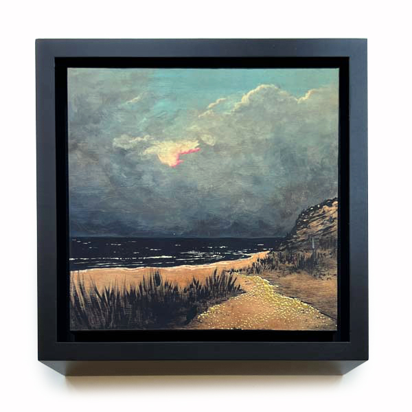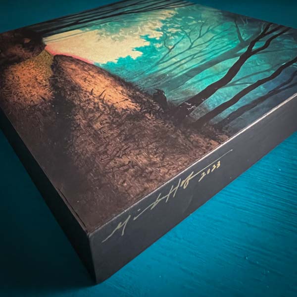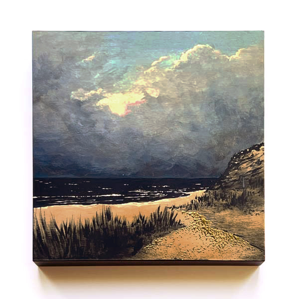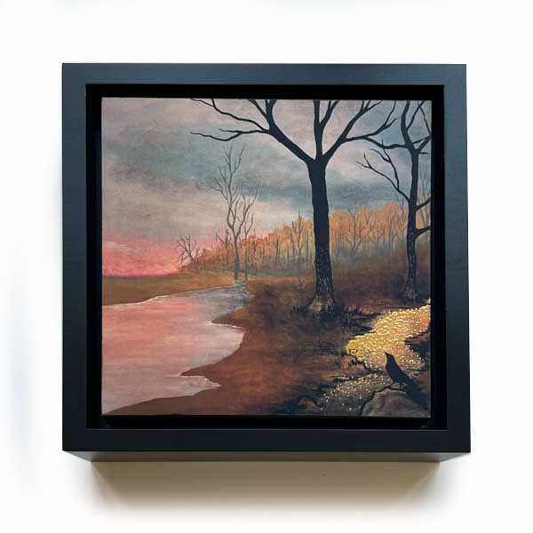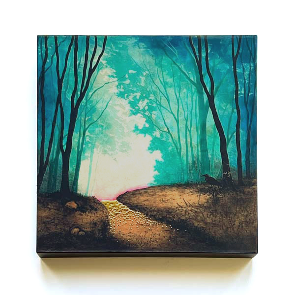 These 6 x 6 inch mounted prints with gold-embossed details feature landscape images from the 2021 Good Way Collection (clockwise from top left): North to the Mountains, East to the Woods, West to the Stream or South to the Sea. Each landscape image presents a walking path (accented with embossed gold) headed in different directions from a crossing. These works feature a barren foreground originally executed in black ink and charcoal opening into a painted, full color background. Found in each of the Good Way images is also a black raven figure.